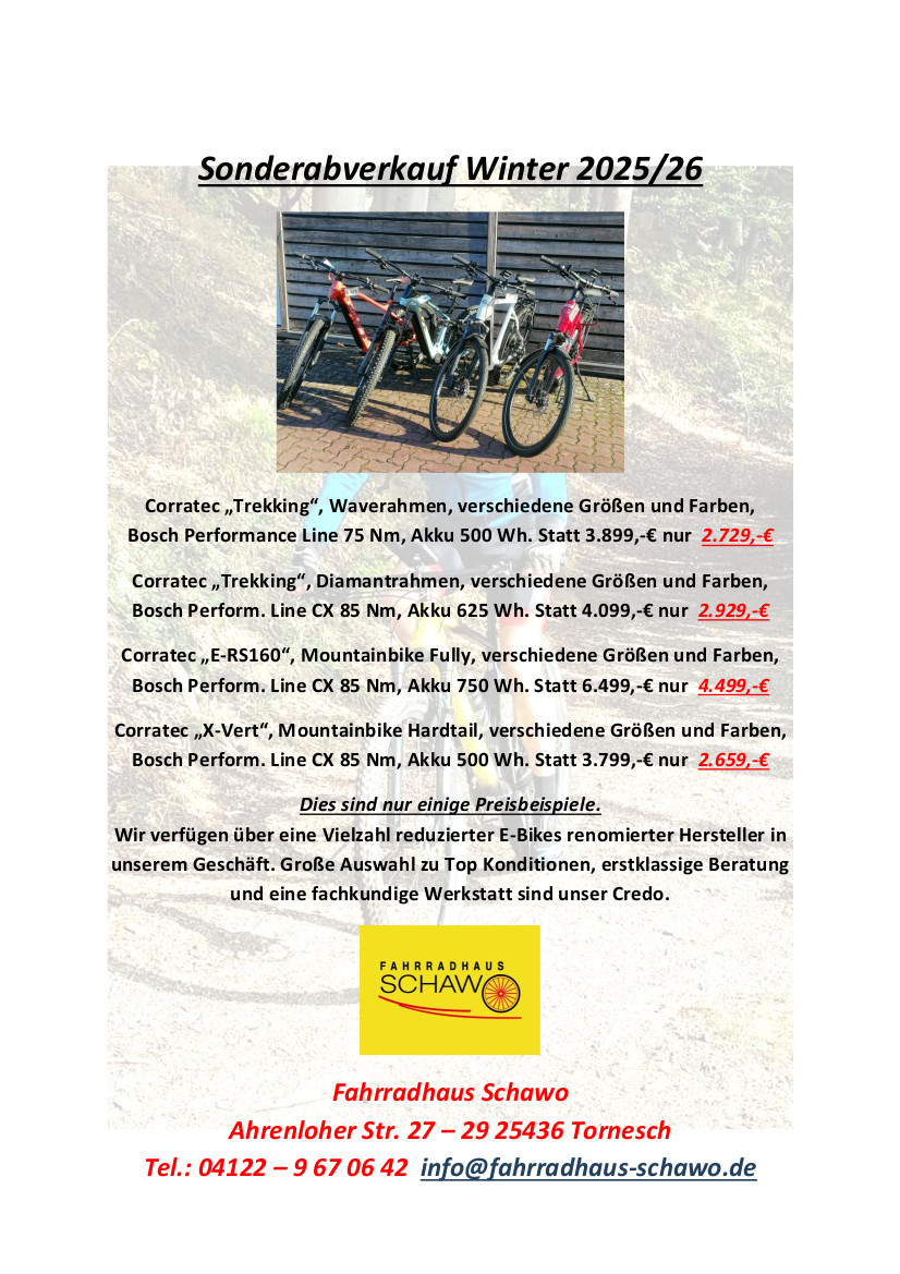 Mit dem Fahrradhaus SCHAWO bleiben Sie nicht radlos zurück! Unsere Philosophie ist es, das bestmögliche Fahrrad für Ihre Bedürfnisse zu finden. Daher nehmen wir uns auch gerne die Zeit für eine persönliche und individuelle Beratung. Selbstverständlich können Sie alle Modelle auch ausgiebig in unserer herrlichen Umgebung Probefahren. Sonderabverkauf Winter 2025/26!